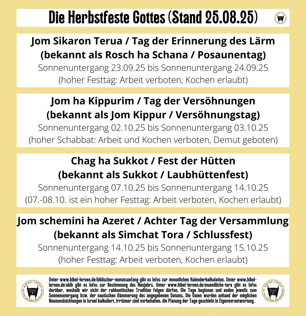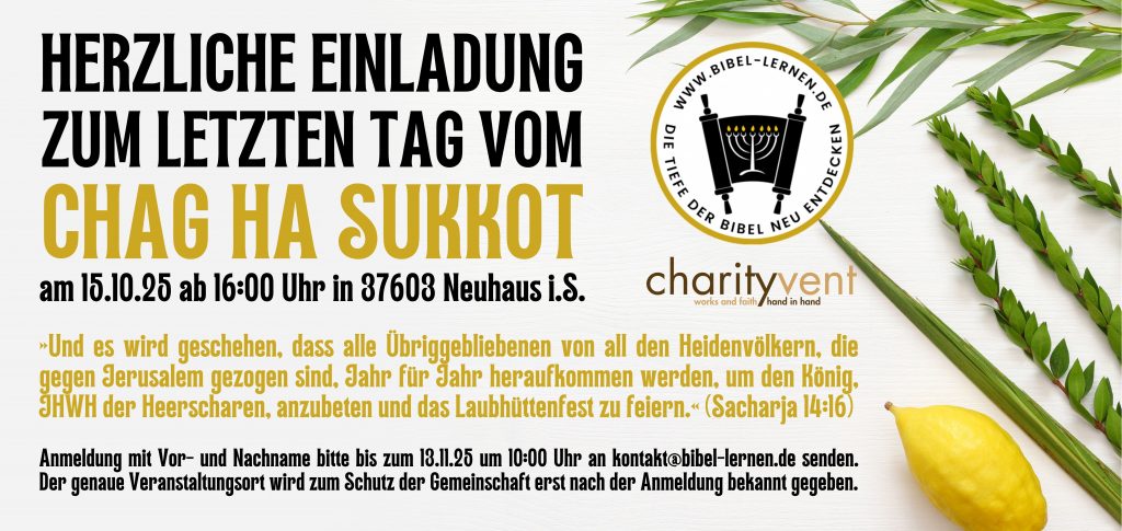 Hiermit laden wir herzlich alle Geschwister am Mittwoch, dem 15.10.2025, zum achten und letzten Festtagen von Sukkot in 37603 Neuhaus im Solling ein. Wir werden gemeinsam beten und lobpreisen, vor und nach dem Gottesdienst haben wir Gemeinschaft.